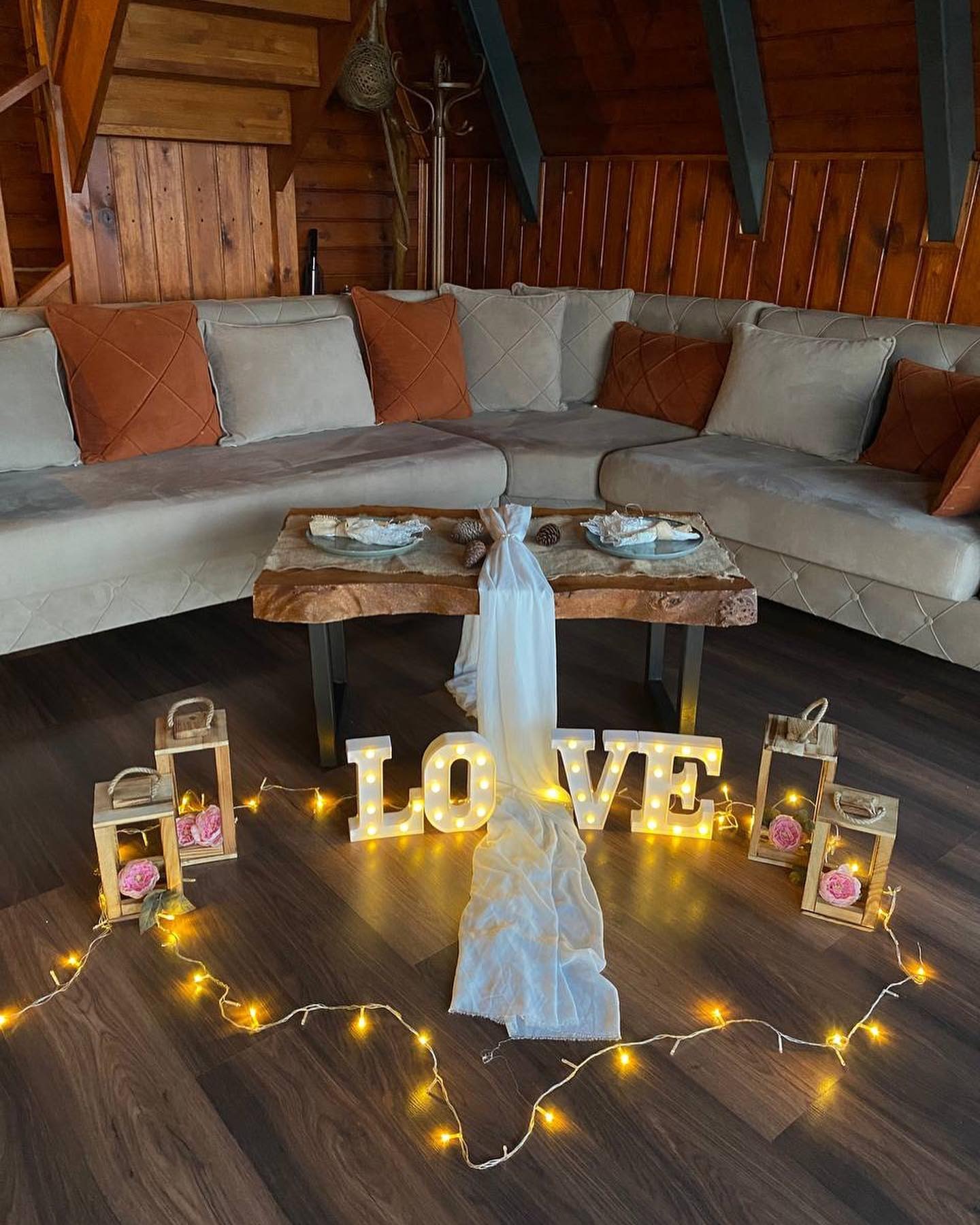 Gül yaprakları, balonlar, mumlar ve özel dekorasyon ile romantik bir atmosfer